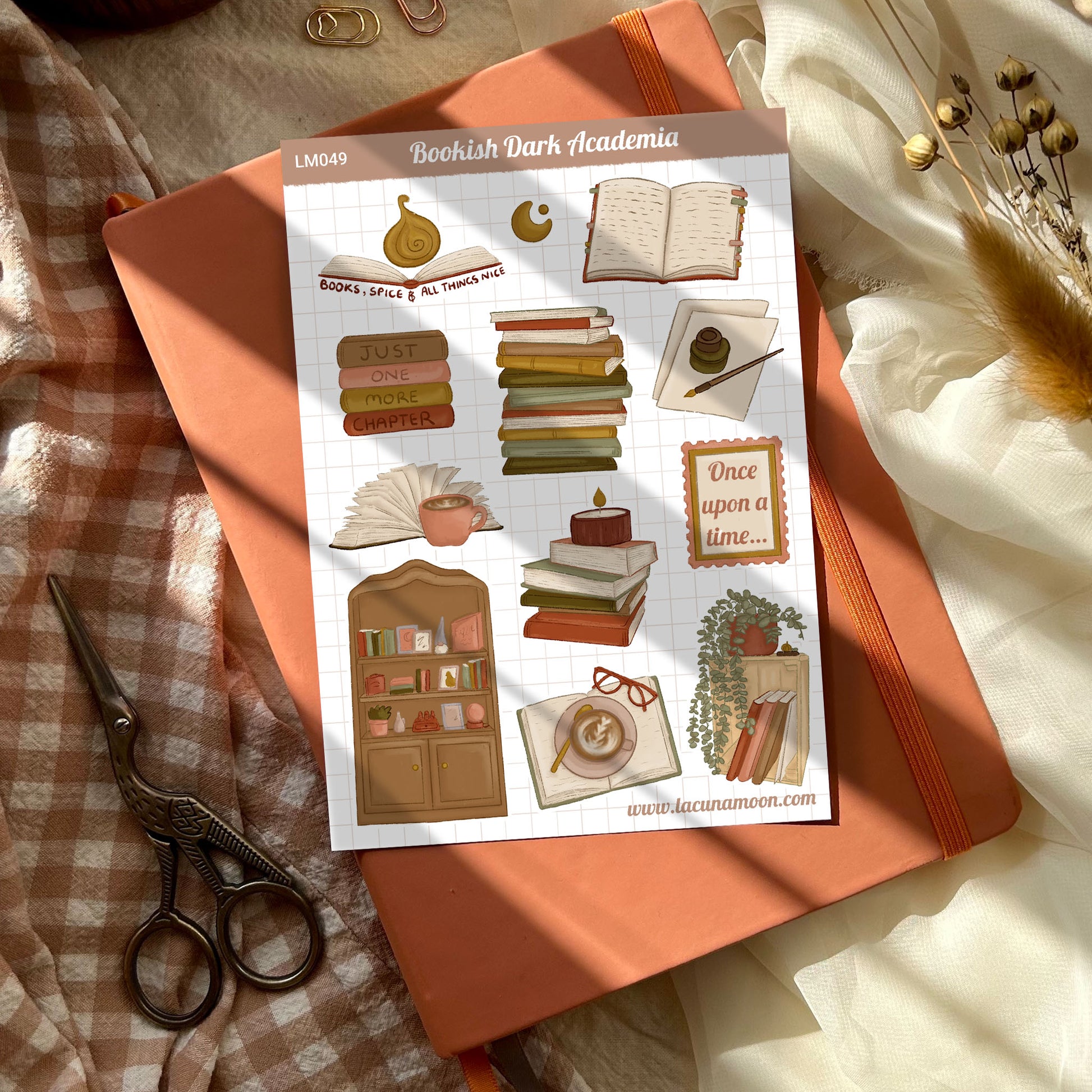 Express your love for books with our quirky Bookish Dark Academia Sticker Sheet! Featuring lots of books and more, these stickers will add character to your journals. Perfect for bookworms and avid readers alike!