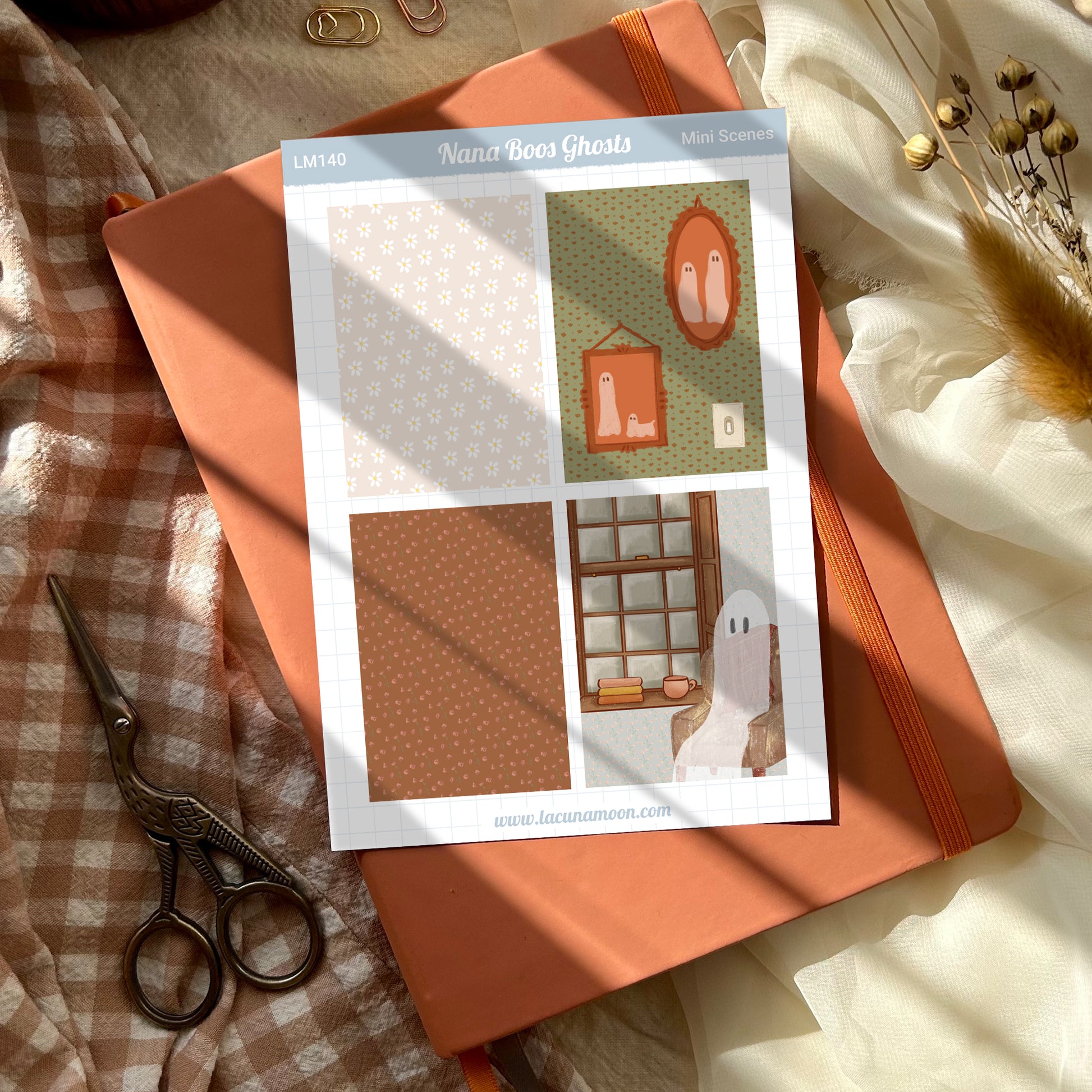 Get ready to add some spooky and cute fun to your life with these Nana Boo Ghost Mini Scenes Sticker Sheets! With patterned wallpaper and adorable illustrations, these stickers are perfect for decorating notebooks, journals, and more.Spruce up your spreads with these ghostly goodies!