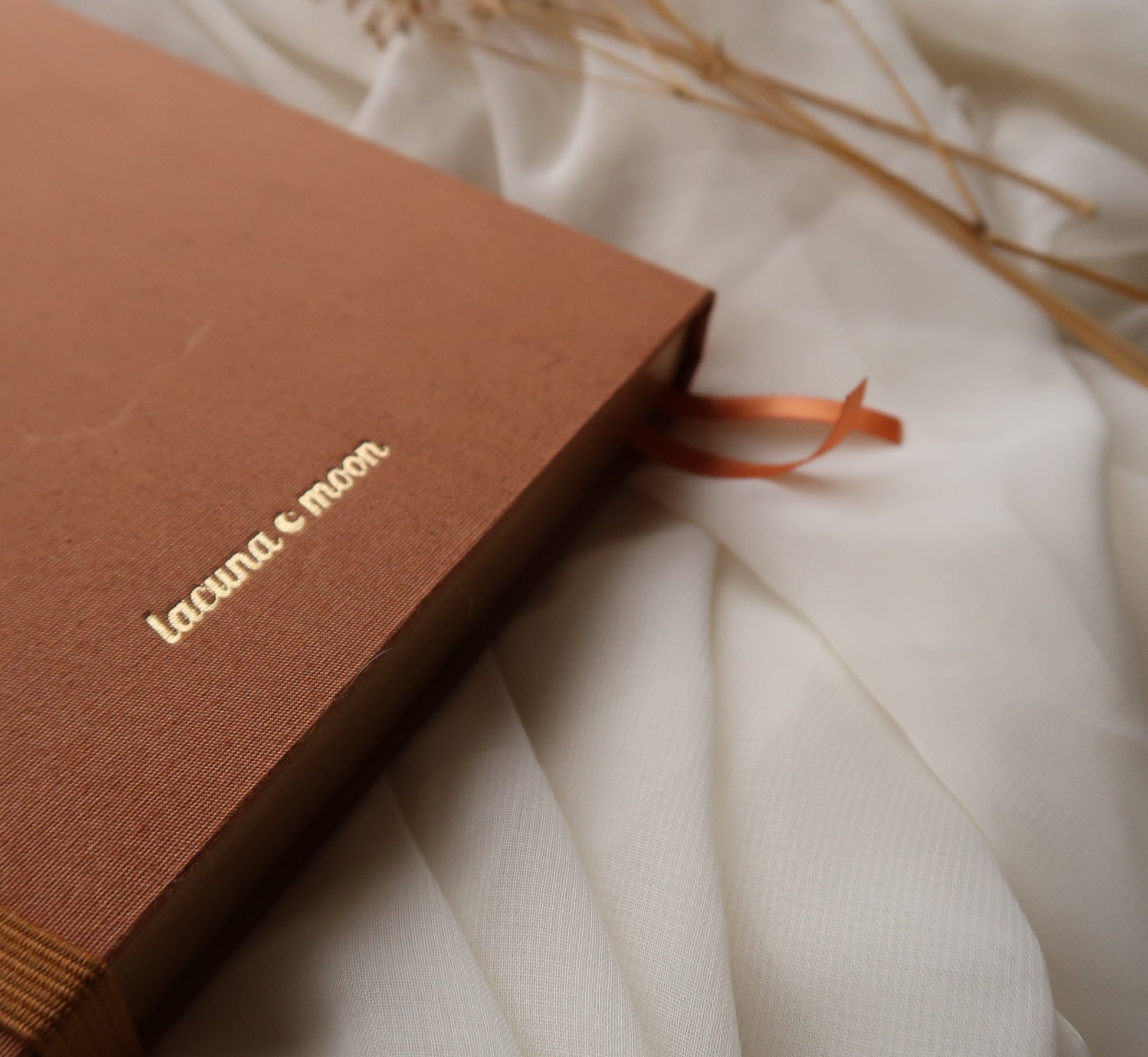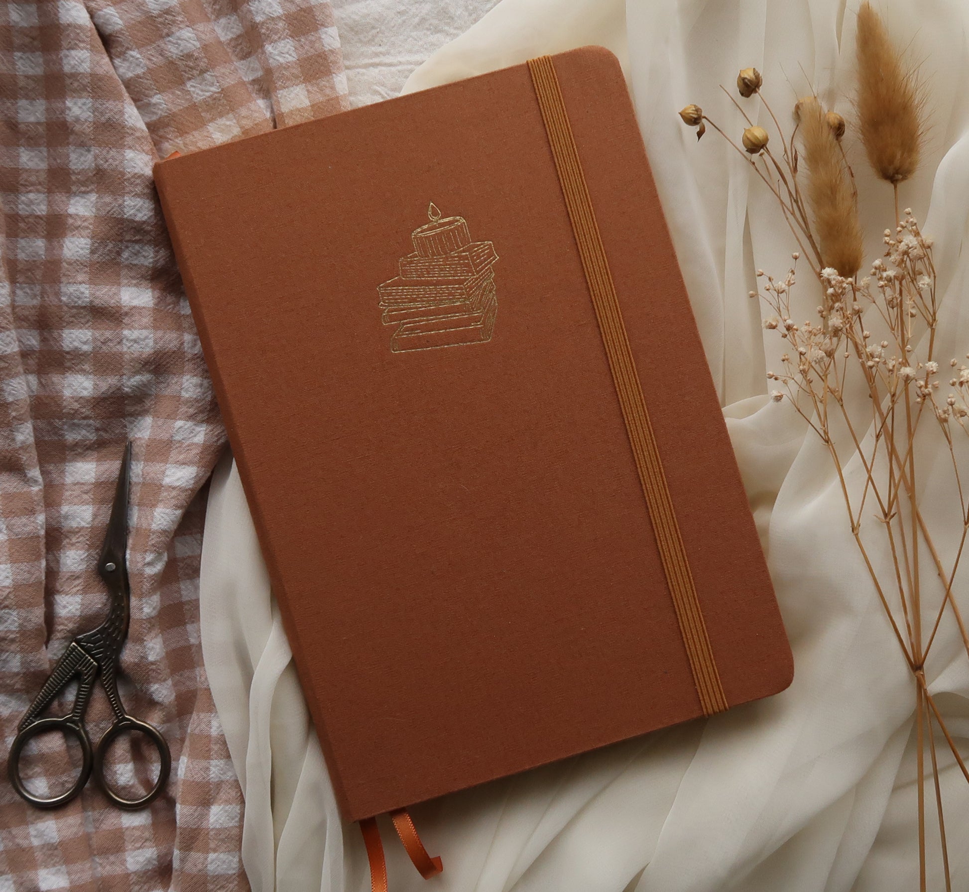 Introducing our luxury journal, crafted for those who seek mindfulness through the art of journaling and planning. Featuring an elegant, earthy fabric cover with a gold-embossed stack of books and a candle, this journal evokes a sense of warmth and introspection.